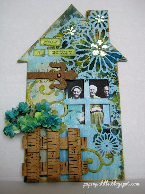 I wanted a garden theme, but I didn't have a gate die or stamp, so I made a gate out of vintage measuring tape I picked up at a local flea market. I backed each piece with thin cardboard strips to give it more stability, then sponged on brown ink on the edges. (I think I splattered some blue in on it accidentally, but it just adds to the vintage look)